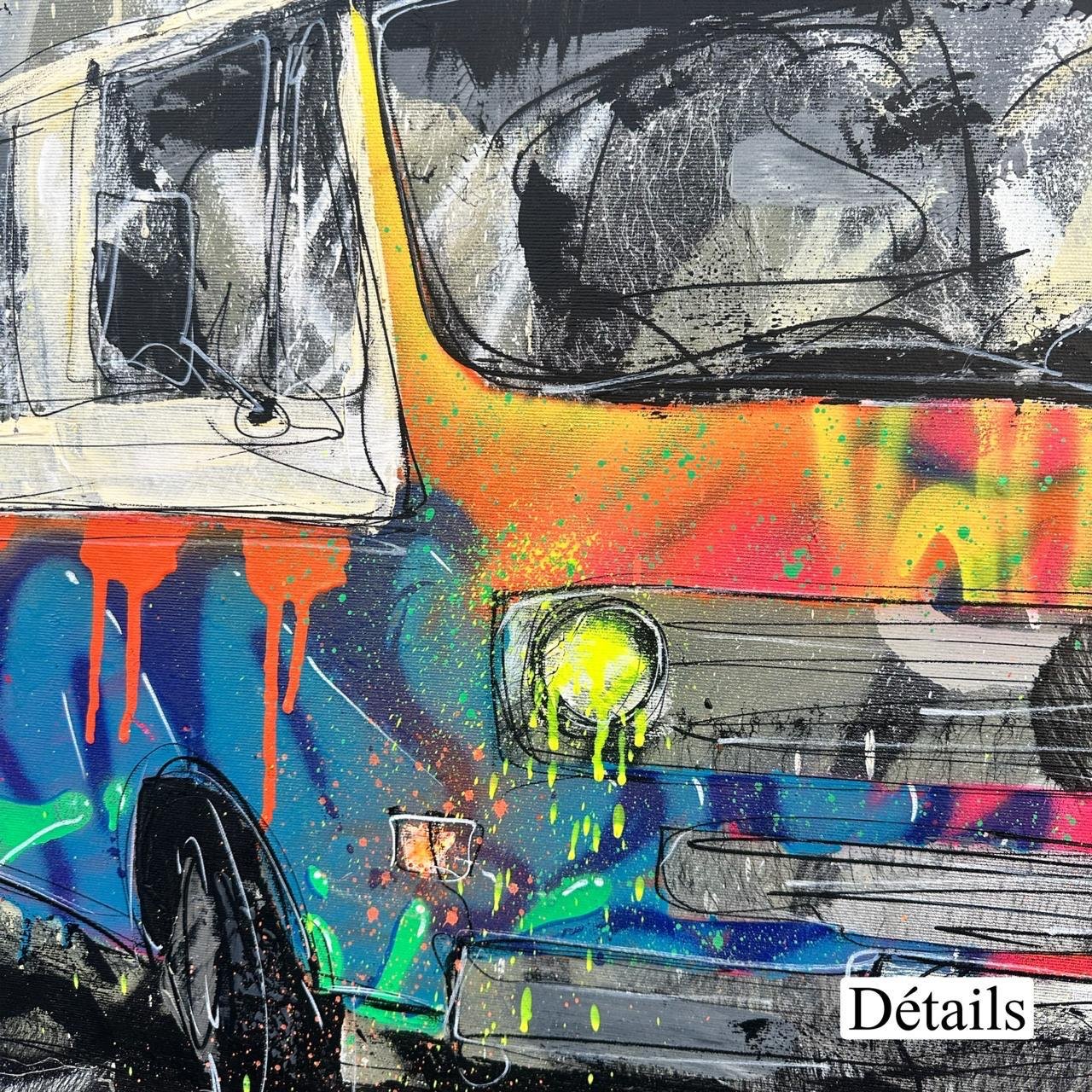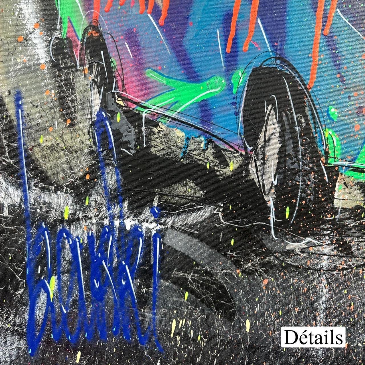 Sa pratique se distingue par une palette vive et l’usage de techniques mixtes — aérosol, peinture, sur des supports variés tels que la toile, le bois, les plaques d’immatriculation ou la carrosserie. Entre poésie et tension brute, ses œuvres racontent des fragments de vie, célébrant la liberté, la mémoire et la vitalité du monde urbain.
